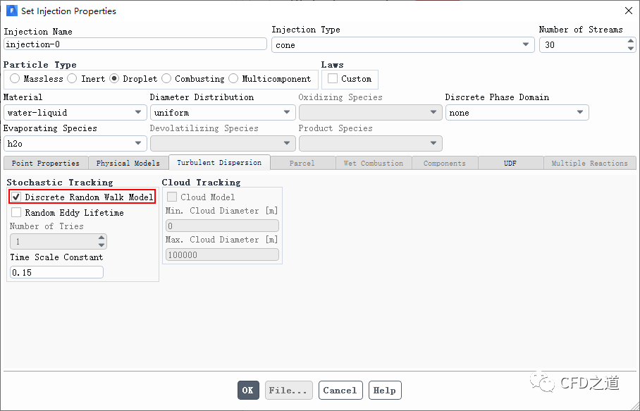 进入 Turbulent Dispersion标签页,激活选项Discrete Random Walk Model,如下图所示设置