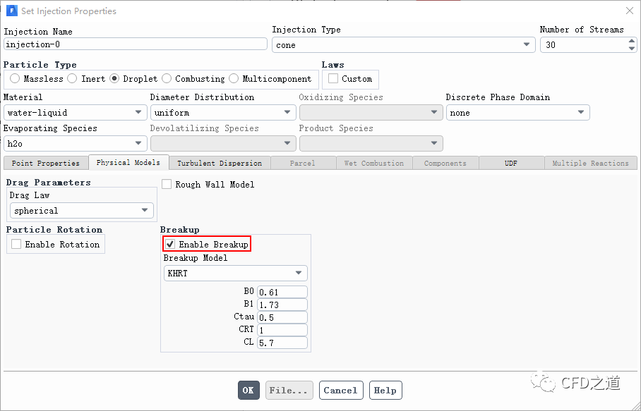 进入 Physical Models标签页,激活选项Enable Breakup,选择破碎模型为KHRT,采用默认的模型参数