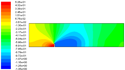 查看计算域内压力分布。在contours 对话框中选择 Contours of 下为 Pressure… 及 Static Pressure,点击 Display 按钮显示压力分布云图。
