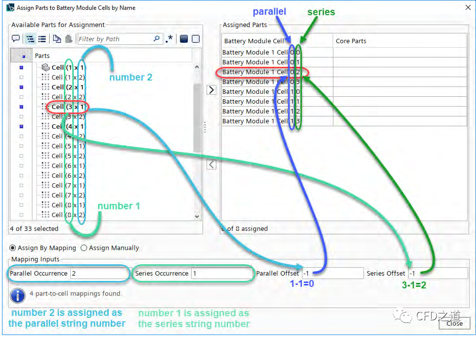 右键选择模型树节点Battery Module 1 ,点击弹出菜单项 Assign Parts to Battery Module Cells by Name