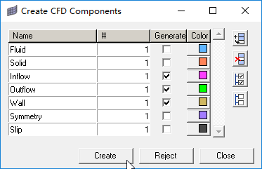 选择菜单BCs → Components → CFD,弹出CFD边界创建对话框,在对话框中选择创建inflow、Outflow及Wall,点击Create按钮创建边界