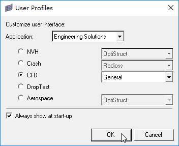 HyperMesh启动后会弹出User Profiles对话框,选择CFD及General