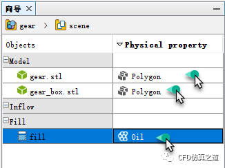 向导中设置gear.stl及gear_box.stl的材料为Polygon,修改fill的材料为oil