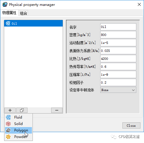 设置材料名称为Oil,设置密度为800 kg/m3,运动粘度为1e-5 m2/s