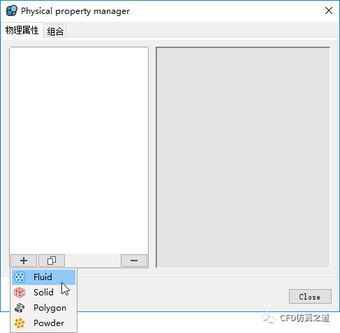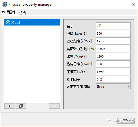 在对话框中点击加号按钮添加Fluid材料