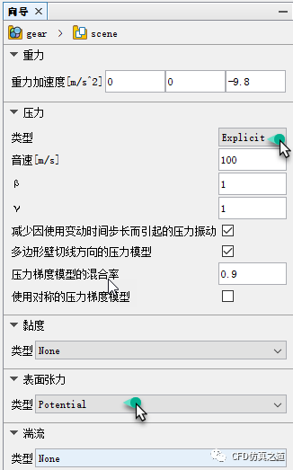 设置压力类型为Explicit,设置表面张力类型为Potential,点击下一步按钮进入热设置面板