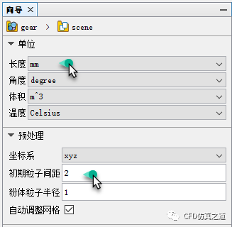 向导面板中设置长度单位为mm,设置初期粒子间距为2,点击下一步按钮进入下一步设置