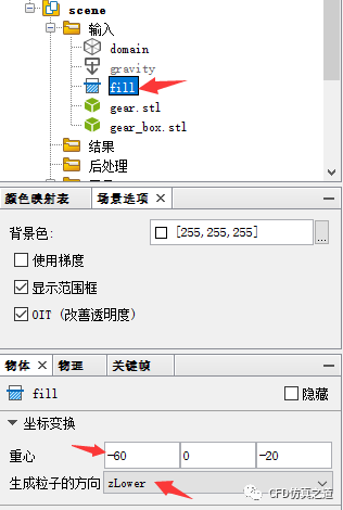 选中模型树Fill节点,属性窗口中设置重心为[-60 0 -20],设置生成粒子的方向为zLower