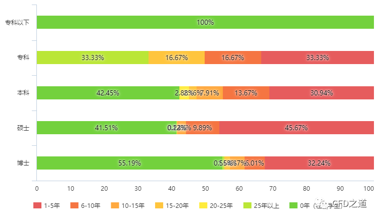 从表中数据来看,工作人群中,硕士占了绝大多数。博士与本科生比例相当。
