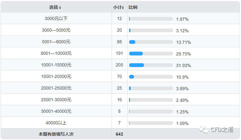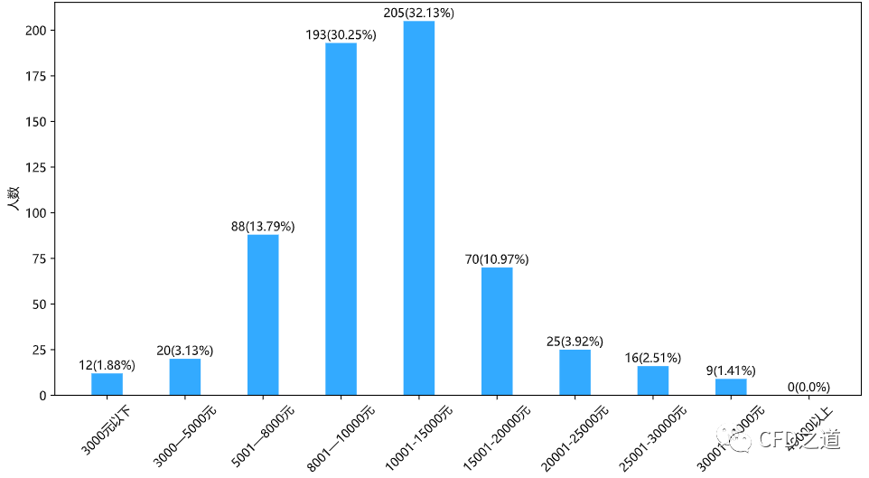月薪分布看起来蛮像正态分布。参与调研的642人中,月薪8000~15000元的占到了61.68%,其中人数最多的月薪区间落在10000-15000元之间,人数占比31.93%。