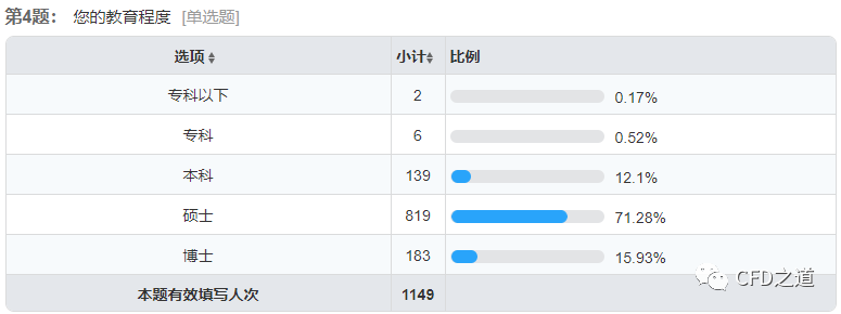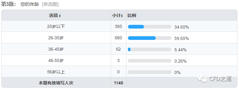 投票人群中,硕士群体是当之无愧的主力军,占比达到71.28%。其次为博士群体,占到了15.93%。然而这个数据包含了在校生,所以我可能会出现一些博士生和硕士生的情况,至于这部分人群毕业后是否还会从事与CFD相关的工作,那就不得而知了。