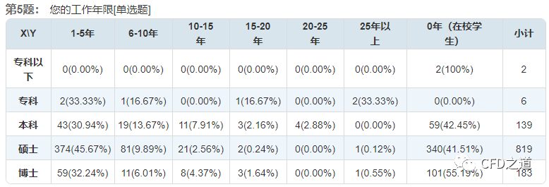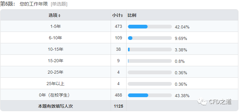 从图中实际上还能简单反映出:随着工作年限的增加,CFD从业者转行比例比较大。当然可能一部分转行做管理不再从事直接的技术,也有可能是直接转行做别的技术。