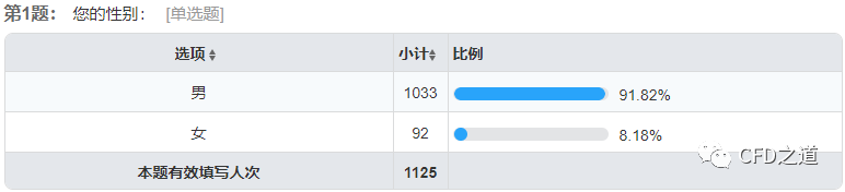 在所有的投票数据中,男女比例如下图所示。在总共1125份投票中,只有92份来自于小姐姐。这个数据告诉我们,耍CFD的小姐姐是极少的,如果你身边有耍CFD的小姐姐,一定要倍加爱护。