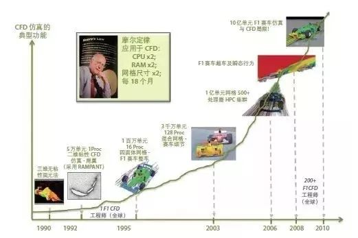 图3 CFD 的发展离不开硬件的进步 – 采用 I 级方程式赛车描述的 CFD 1990 - 2010 年发展趋势 (Hanna & Parry , 2011)