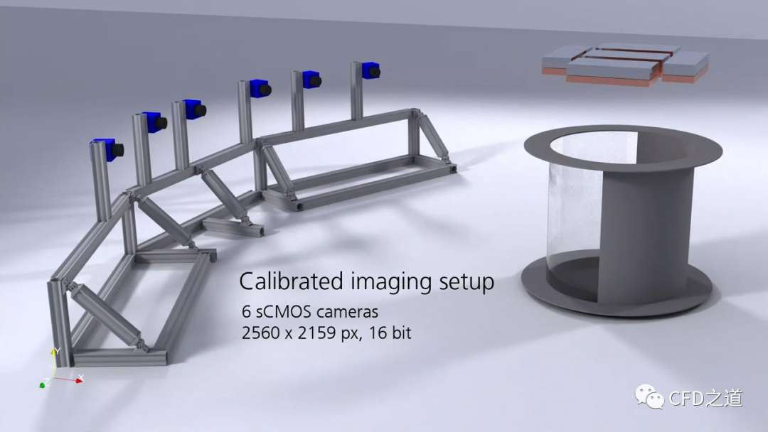 直径和高度为1.1 m(长宽比=1)的空气样本在容器顶部被水流冷却,而在容器底部通过电对其进行加热。空气中充满了微小的(380µm)充氦肥皂泡,由于其中性密度,理想情况下,这些肥皂泡会沿着水流流动,平均存活几分钟。气泡由一组大功率LED从上方照亮。