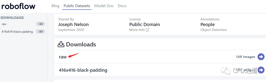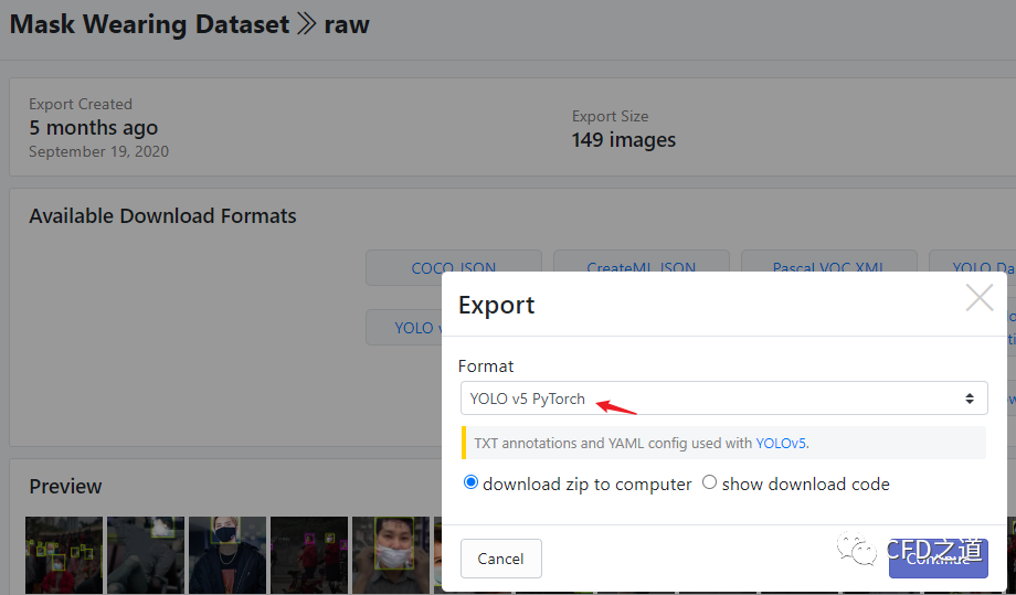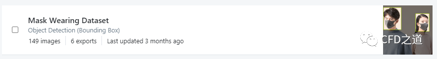 数据集可以自己制作,也可以使用别人制作的。自己制作数据集的话可以使用labelimg,注意选择输出为yolo格式。这里简单起见使用网上公开的数据集。网站(https://public.roboflow.com/)提供了很多用于目标检测的公开数据集,如常见的微软COCO数据集,牛津Pets数据集等。这里找个小型的口罩数据集,这个数据集规模很小,只有149张照片。(呃,相对于COCO十几万张照片来说真的可以忽略不计了)