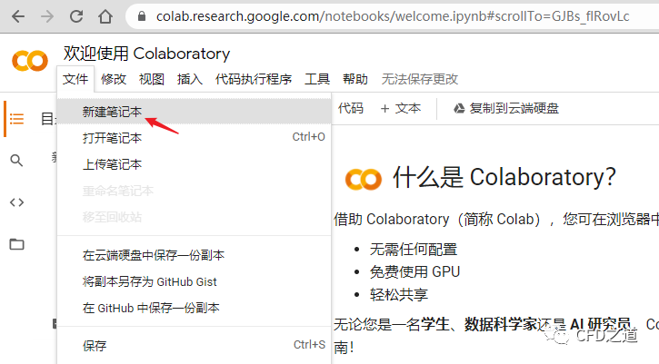 进入Colab后第一步是新建一个笔记本,如下图所示。