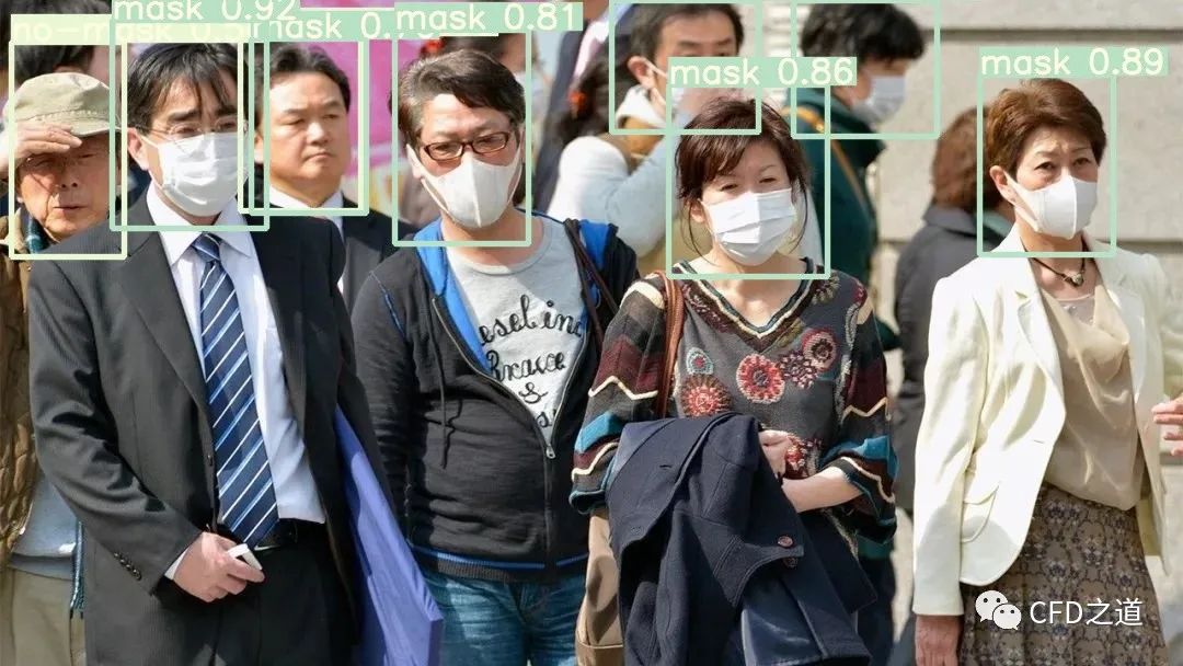 识别后的结果存放在文件夹run/detect/exp中。打开该文件夹中的mask.jpeg文件,识别结果如下图所示,可以看到识别效果还是很不错的。只是这里人头太密集导致标签都堆起来了。