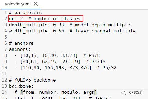 修改文件 yolov5/models/yolov5s.yaml,将nc = 80修改为nc = 2,因为数据集中只有mask和no-mask2个类别,这里需要与数据集类别数保持一致