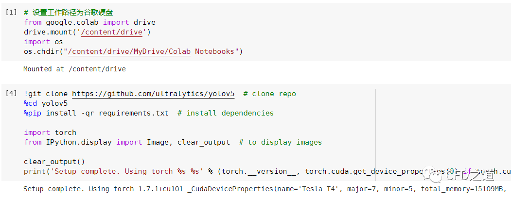 可以看到此时Colab给分配了一个Tesla T4的显卡,显存16G。pytorch版本为1.7.1,cuda版本为10.1。