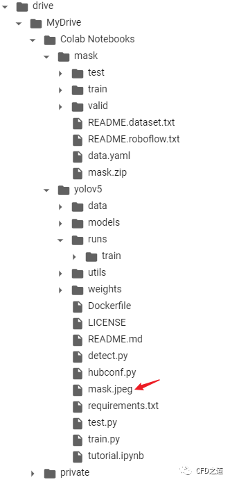 将图片上传到Colab中,重新命名为mask.jpg(什么名字都可以,这里只是方便后面描述),将文件放到yolov5文件夹中。