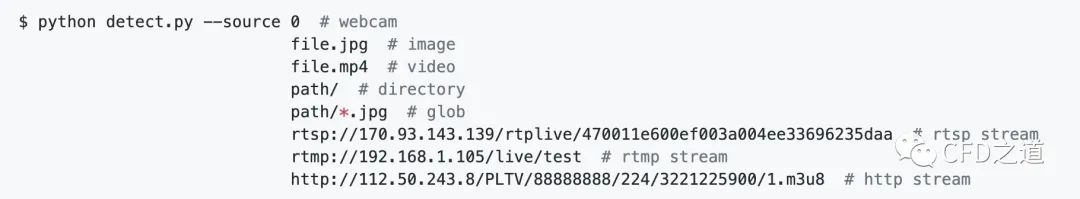 yolov5不仅提供了对静态图片的目标检测,还可以对视频文件、网络视频等进行实时检测。调用格式如下图所示。