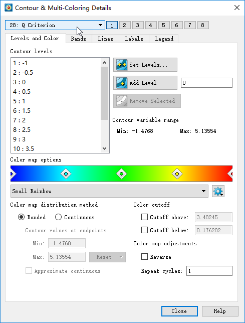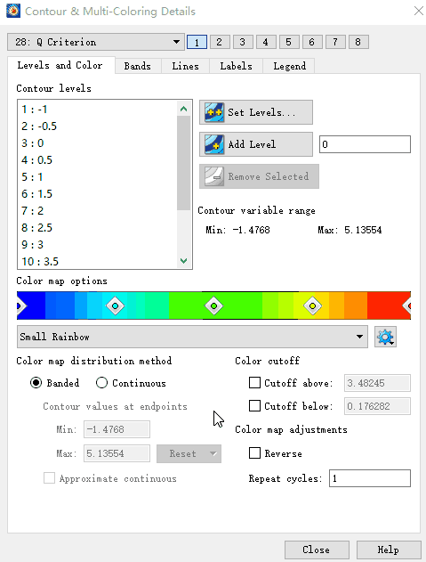 删除Contours Levels列表项中的所有选项,点击按钮Set Levels…按钮,设置最小值为0,最大值为0.15,等级数量为10,点击OK按钮