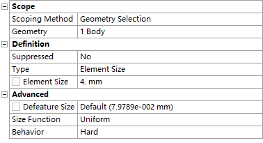 设置Geometry为流体域几何体,设置Element Size为4 mm,设置Behavior为Hard