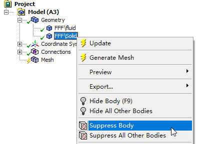 右键选择模型树节点FFF/Solid,选择弹出菜单Suppress Body去除固体部分几何