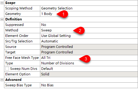 在参数设置窗框中设置Geometry为整个流体域几何,设置Method为Sweep,设置Free Face Mesh Type为All Tri,其他参数保持默认