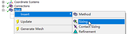 右键选择模型树节点Mesh,点击弹出菜单Insert → Sizing插入网格尺寸