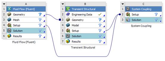 搭建的计算流程如图所示。其中几何模型在流体流程中导入,双向耦合数据通过System Coupling进行中转。