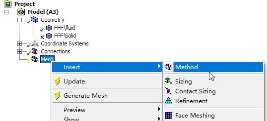 右键选择模型树节点Mesh,选择弹出菜单Insert → Method插入新的方法