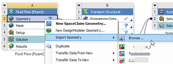 右键选择A2单元格,选择弹出菜单Import Geometry→Browse…添加几何文件FFF.scdoc