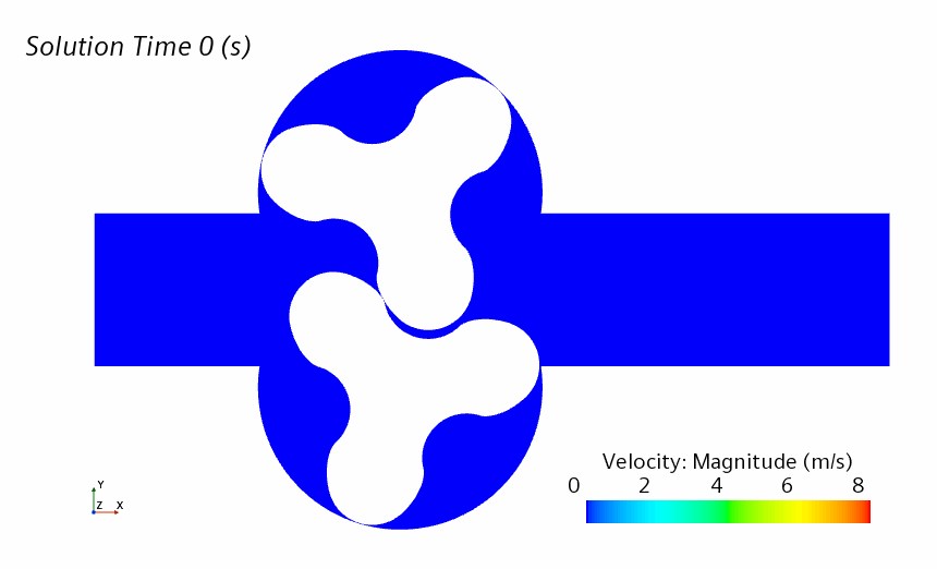 计算模型如下图所示。空气通过入口进入计算域,在经过旋转的凸轮(二者均以 500 rpm 的角速度反向旋转)后,从出口流出。