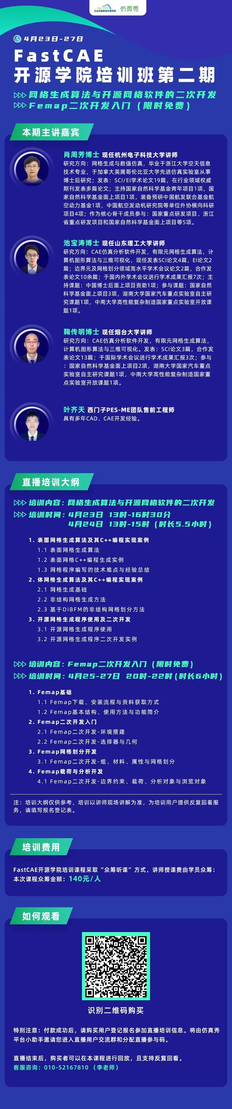 FastCAE联手仿真秀平台打造开源仿真软件培训体系!FastCAE开源学院组织的学术讲座、培训课程均由仿真秀平台在线直播与视频回放。FastCAE开源学院第2期培训课程将于4月23日(周六)13时开讲!快快扫描下图中的二维码报名吧!订阅用户可以进入技术交流群、获取课程最新信息!