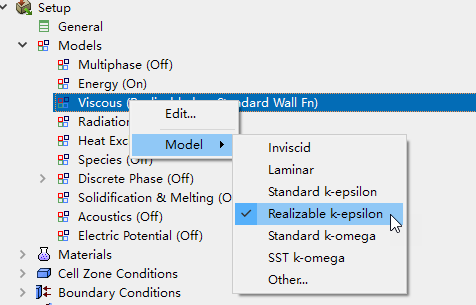 右键选择模型树节点Viscous,点击弹出菜单项Models → Realizable k-epsilon,激活Realizable k-epsilon湍流模型