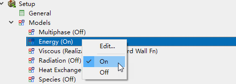 右键选择模型树节点Models > Energy,点击弹出菜单项On激活能量方程