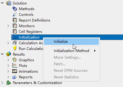右键选择模型树节点Initialization,点击弹出菜单项Initialize进行初始化计算