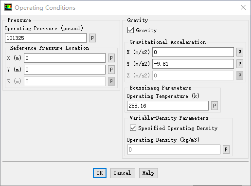 双击模型树节点Boundary Conditions,点击右侧面板按钮Operating Conditions…打开操作条件设置对话框