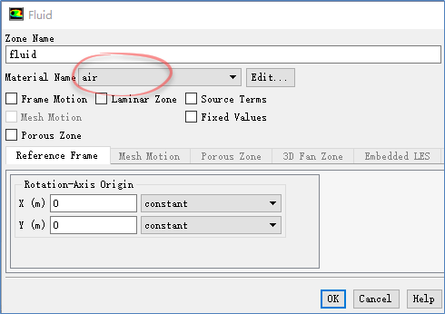双击模型树节点Cell Zone Conditions> fluid,弹出区域设置对话框,设置Material Name为air,其他参数保持默认设置,点击OK按钮关闭对话框
