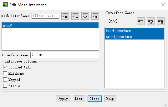 在弹出的Edit Mesh Interfaces对话框中,激活选项Coupled Wall,点击按钮Apply设置该分界面为耦合面