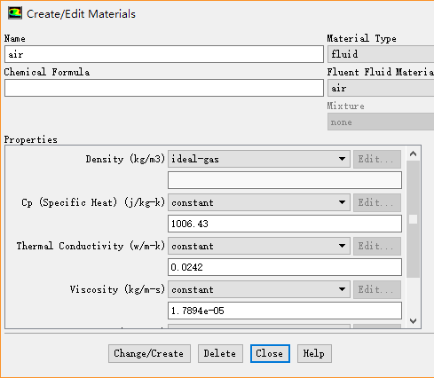 设置Density为ideal-gas,其他参数保持默认设置,点击Close按钮关闭对话框