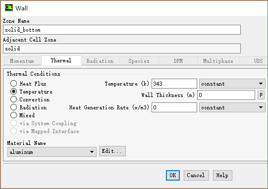 切换至Thermal标签页,设置Thermal Conditions为Temperature,并设置Temperature为343 K,其他参数保持默认设置,点击OK按钮关闭对话框
