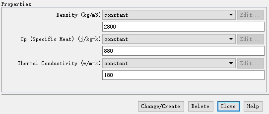 双击模型树节点Materials > Fluid > aluminum,弹出材料参数设置对话框,设置Density为2800 kg/m3,设置Cp为800 j/kg-k,设置Thermal Conductivity为180 w/m-k,点击按钮Change/Create修改材料参数