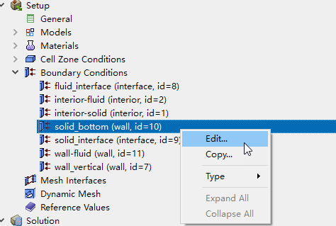 右键选择模型树节点Boundary Conditions > solid_bottom,点击弹出菜单Edit…打开边界条件设置对话框