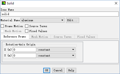 双击模型树节点Cell Zone Conditions> fluid,弹出区域设置对话框,设置Material Name为aluminum,其他参数保持默认设置,点击OK按钮关闭对话框