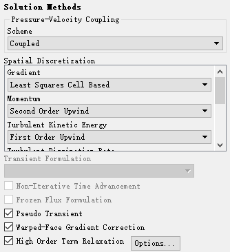 双击模型树节点Methods,右侧面板中设置Scheme为Coupled,激活选项Pseudo Transient、Warped-Face Gradient Correction,其他参数保持默认设置
