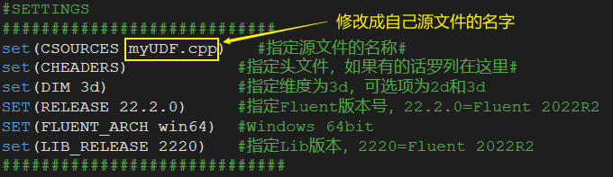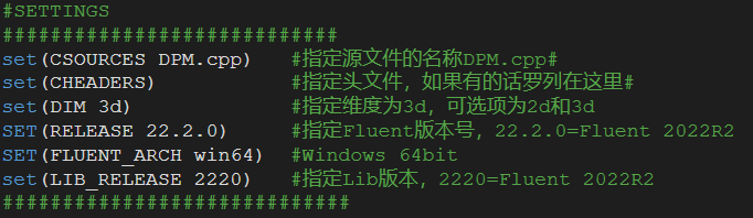 注释写得挺明白了。注意这里设置的版本号必须与前面在环境变量中指定的FLUENT_INC的版本一致。另外这里的3d编译出来的UDF版本是3ddp,若想要编译3d版本,则需要修改node及host中的CMakeLists.txt文件中第2行的内容,将dp去掉即可。