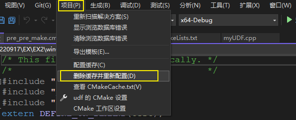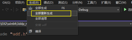 相应的也需要修改示例源文件 DPM.cpp修改为自己想要的名字,例如这里将其修改为myUDF.cpp。修改文件名后VS会提示错误,此时利用菜单生成 → 全部清理刷新一下就可以了。